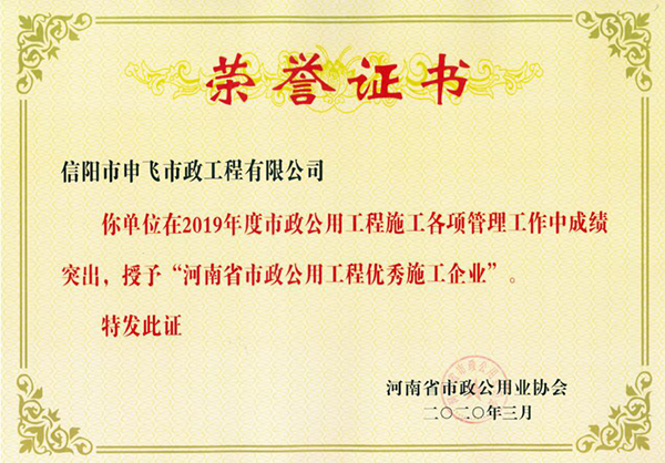 除省金杯獎之外,公司承建的中心城區(qū)浉河兩岸排污口過渡性污水污水二期工程二標(biāo)段被評為“河南省市政優(yōu)良工程”,平橋區(qū)平東路(浉河北路-平橋大道)新建工程(二標(biāo)段)被評為2019年度“市政工程省級安全文明工地”。